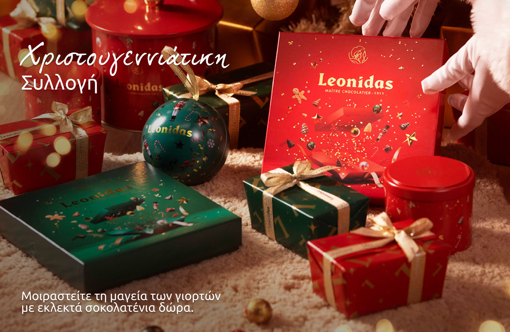 Κουτί μπαλοτέν με 750 γρ σοκολατένιες χριστουγεννιάτικες μπαλίτσες Leonidas σε 13 γεύσεις: dark praliné, milk salted caramel,milk sparkling praliné, milk hazelnuts paste, milk praliné biscuit, white praliné puffed rice. milk chocolate vanilla flavoured cream, white chocolate praline and hazelnuts, creme brulee dark, mont blanc chestnut dark, sparkling praline dark, browine milk, maringue lemon white.