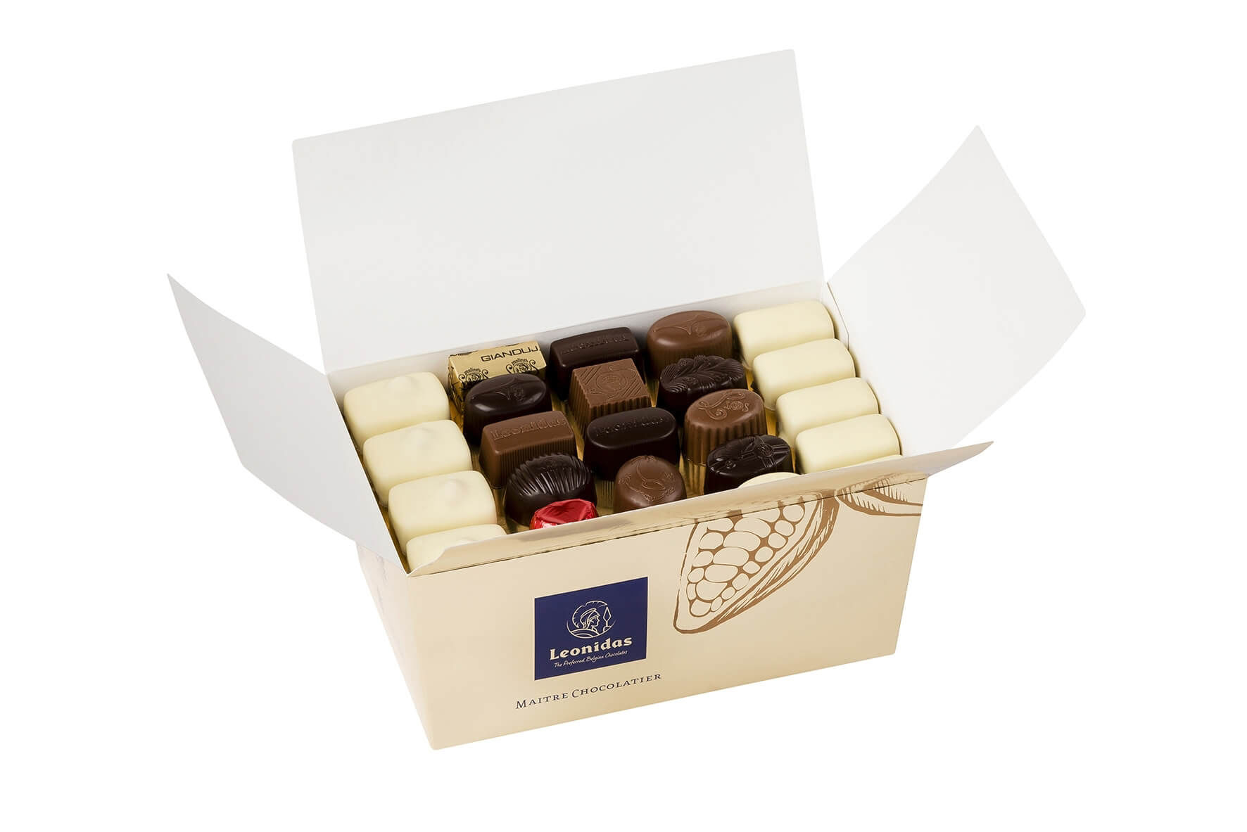 Ποικιλία από 750 γρ. σοκολατάκια Leonidas γάλακτος, υγείας και λευκά με γέμιση από πραλίνα, κρέμα βουτύρου, ganache, καραμέλας, λικέρ, συσκευασμένα στο κλασικό κουτί μπαλοτέν Leonidas!