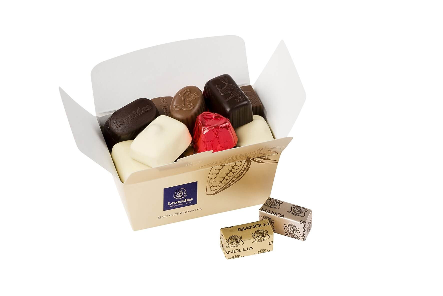 Ποικιλία από 250 γρ. σοκολατάκια Leonidas γάλακτος, υγείας και λευκά με γέμιση από πραλίνα, κρέμα βουτύρου, ganache, καραμέλας, λικέρ, συσκευασμένα στο κλασικό κουτί μπαλοτέν Leonidas!