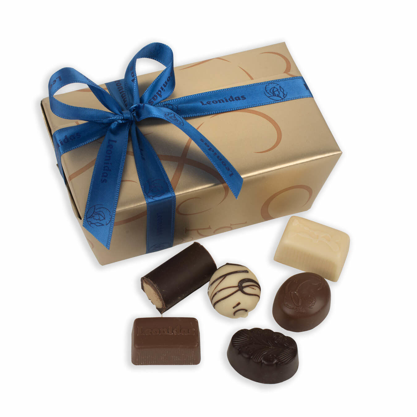 Ποικιλία από 250 γρ. σοκολατάκια Leonidas γάλακτος, υγείας και λευκά με γέμιση από πραλίνα, κρέμα βουτύρου, ganache, καραμέλας, λικέρ, συσκευασμένα στο κλασικό κουτί μπαλοτέν Leonidas!