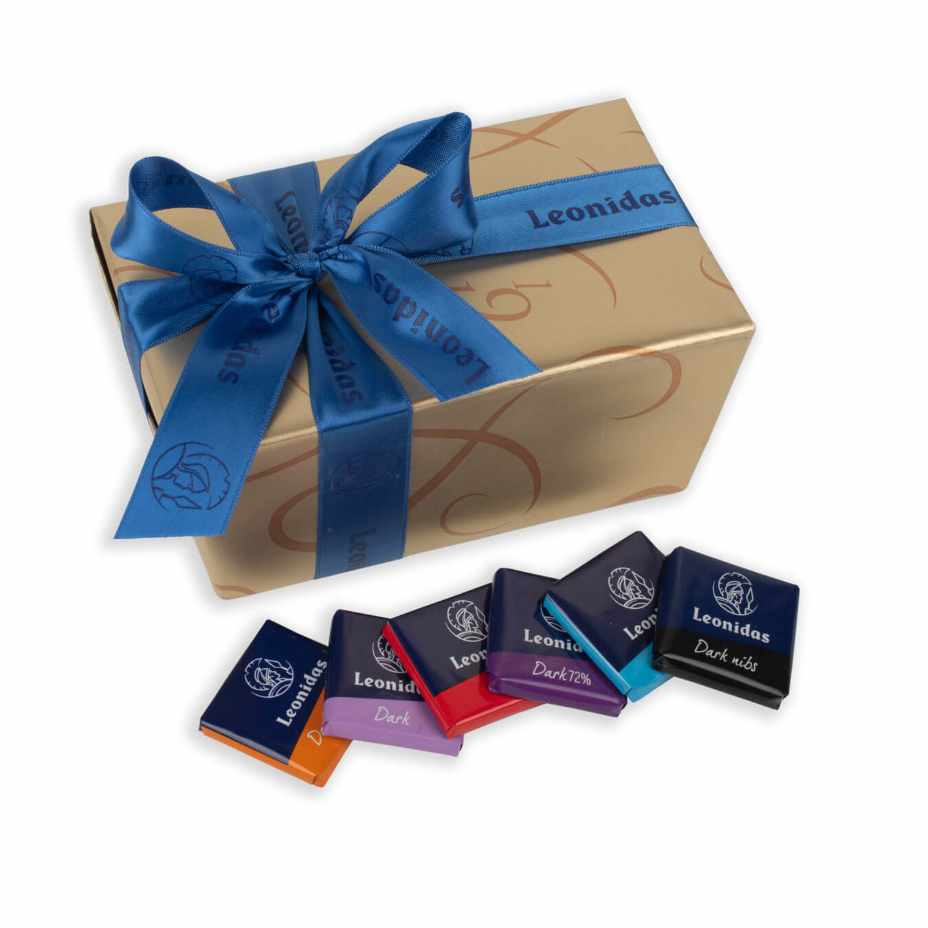 Κουτί μπαλοτέν με 500 γρ. σοκολατάκια Leonidas γάλακτος, υγείας και λευκά χωρίς γλουτένη σε ποικιλία γεύσεων.
