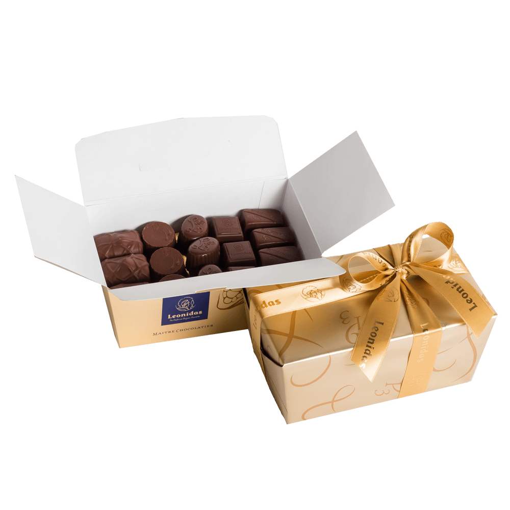 Ποικιλία από 750 γρ. σοκολατάκια Leonidas γάλακτος με γέμιση από πραλίνα, κρέμα βουτύρου, ganache, καραμέλας, λικέρ, συσκευασμένα στο κλασικό κουτί μπαλοτέν Leonidas!