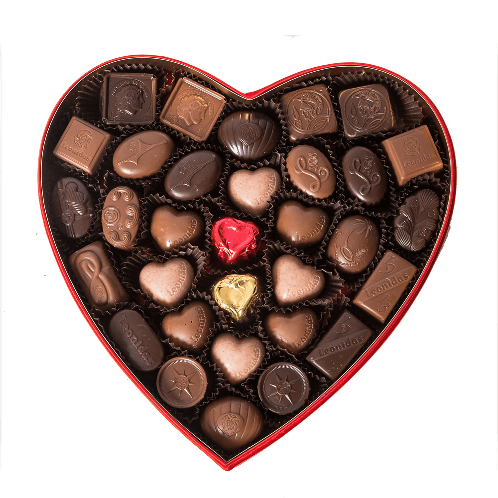 Βελούδινη καρδιά με ποικιλία από 460 γρ. σοκολατάκια Leonidas γάλακτος, υγείας και λευκά με γέμιση από πραλίνα, κρέμα βουτύρου, ganache, καραμέλα, λικέρ.