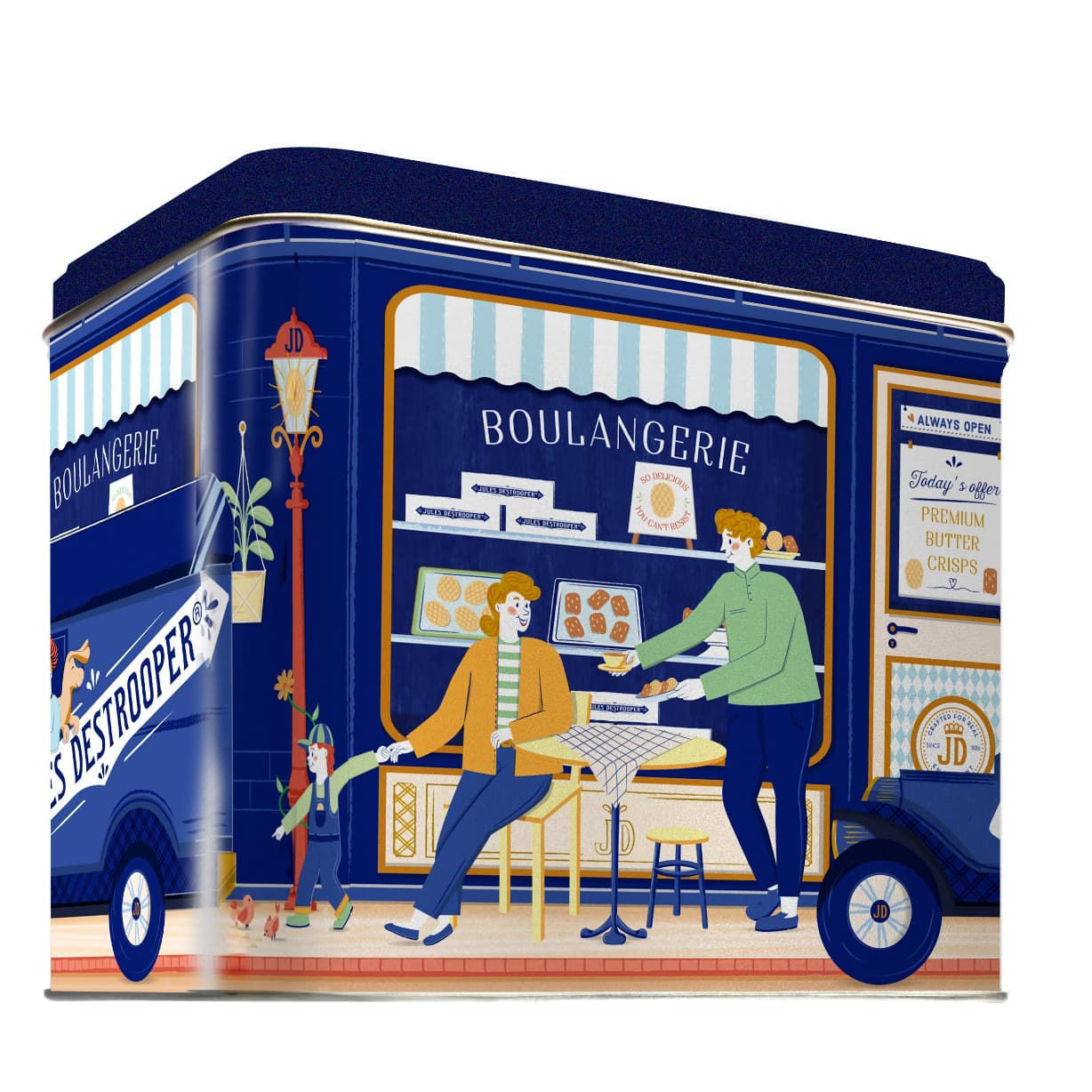 Ανακαλύψτε τη γεύση της αυθεντικής βελγικής παράδοσης με αυτό το συλλεκτικό μεταλλικό κουτί Jules Destrooper “Boulangerie”. Κομψό, με ρετρό εικονογράφηση, εμπνευσμένη από ένα κλασικό αρτοποιείο, μέσα του κρύβει τα φημισμένα Premium Butter Crisps, λεπτά και τραγανά μπισκότα φτιαγμένα με αγνό βούτυρο και την παραδοσιακή συνταγή του 1886. Ιδανικό για να συνοδεύσει τον καφέ ή το τσάι σας, αλλά και ως εκλεπτυσμένο δώρο για κάθε περίσταση.