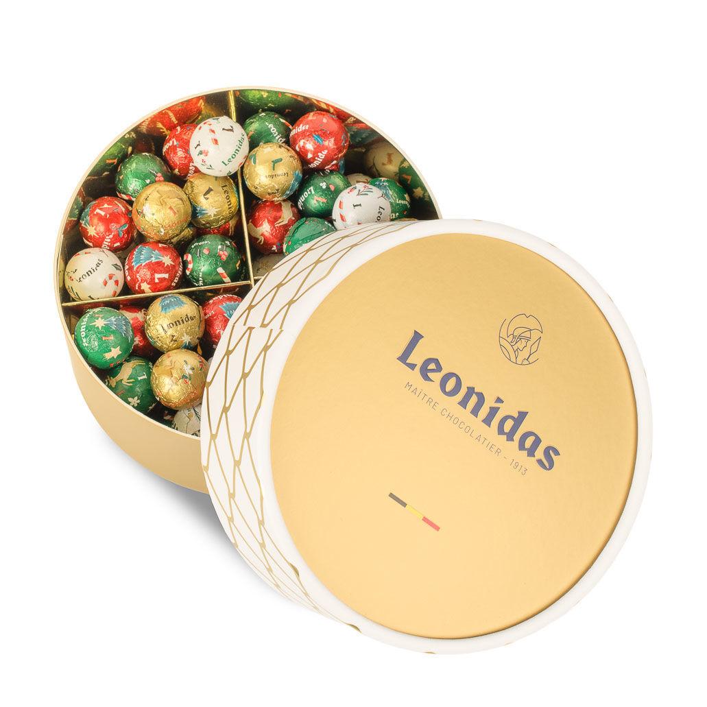 Πολυτελές, πράσινο κουτί με εορταστική θεματολογία, γεμάτο με βελγικές πραλίνες, λαχταριστές γεύσεις γκανάς, καραμέλα, φουντούκι, μπισκότο και πολλά ακόμη, παρασκευασμένες με αγνά υλικά και την παραδοσιακή τεχνογνωσία του διάσημου οίκου Leonidas.