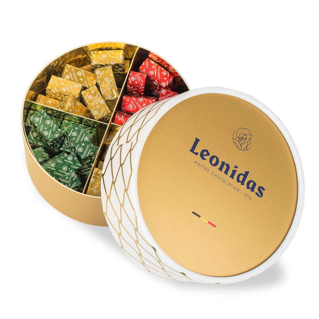 Χάρτινη λευκή καπελιέρα με χρυσό καπάκι και 780 γρ. σοκολατάκια Gianduja, Giantina, Giamanda με Χριστουγεννιάτικο περιτύλιγμα