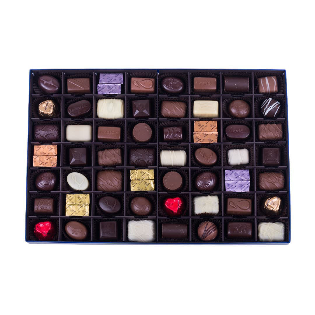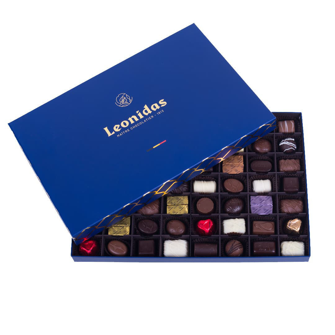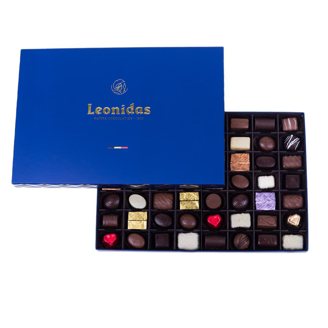 Ποικιλία από 1,5 κιλό σοκολατάκια Leonidas γάλακτος, υγείας και λευκά με γέμιση από πραλίνα, κρέμα βουτύρου, ganache, καραμέλας, λικέρ, συσκευασμένα στο κλασικό κουτί μπαλοτέν Leonidas!