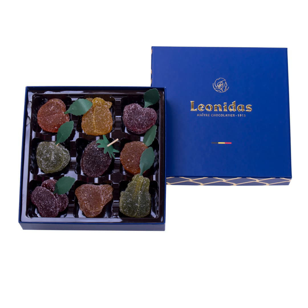 Χάρτινο μπλέ τετράγωνο κουτί Heritage S με 250 γρ pates de fruit (ζελεδάκια φρούτων) Leonidas