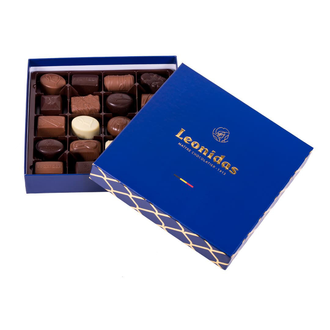 Χάρτινο μπλέ τετράγωνο κουτί Heritage M με 320 γρ σοκολατάκια Leonidas