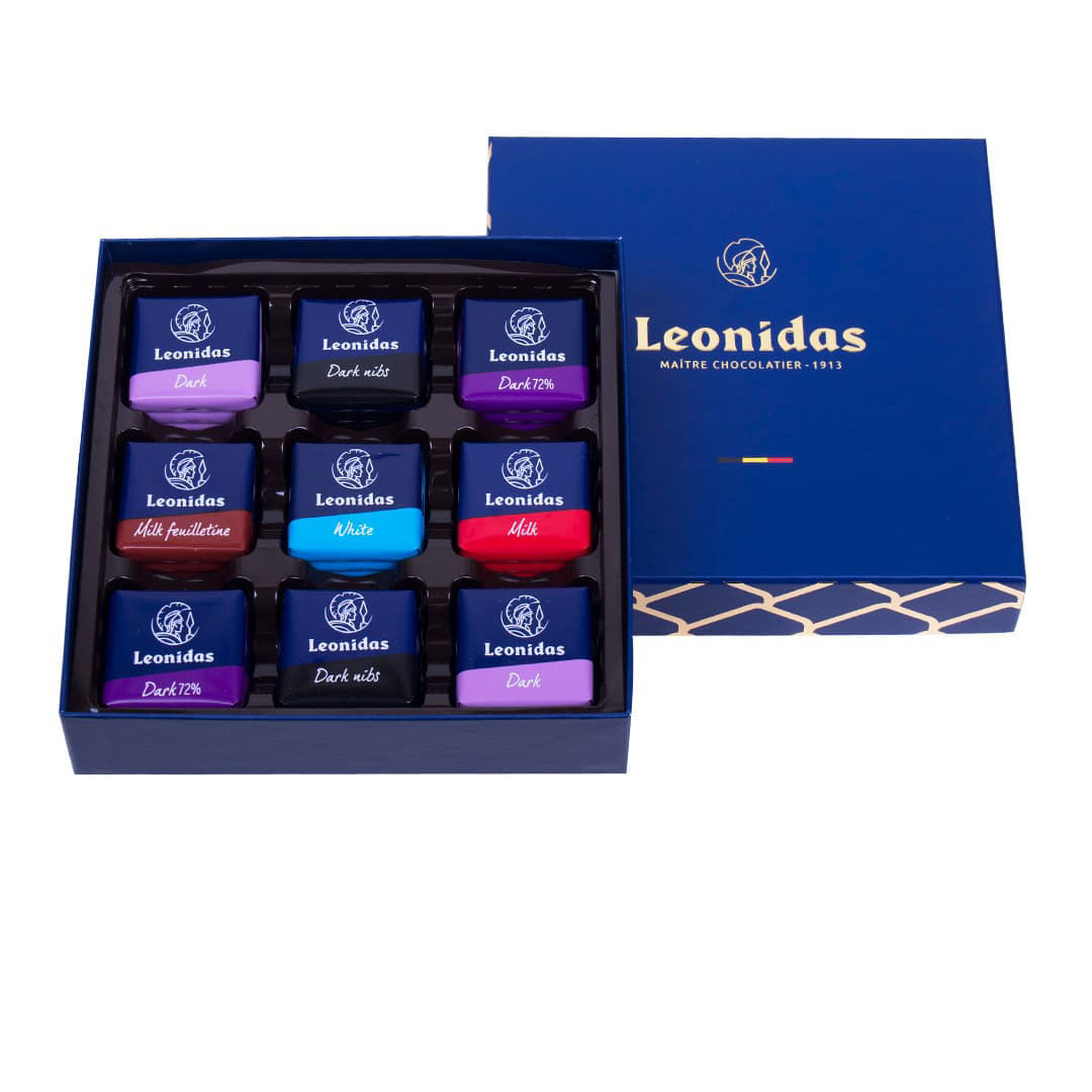 Ποικιλία από 750 γρ. σοκολατάκια Leonidas γάλακτος, υγείας και λευκά με γέμιση από πραλίνα, κρέμα βουτύρου, ganache, καραμέλας, λικέρ, συσκευασμένα στο κλασικό κουτί μπαλοτέν Leonidas!