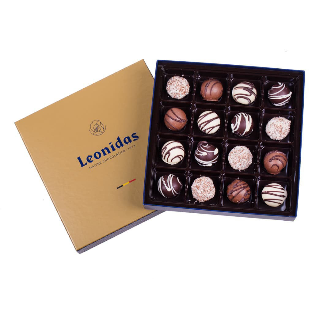 Ποικιλία από 250 γρ. σοκολατάκια Leonidas γάλακτος, υγείας και λευκά με γέμιση από πραλίνα, κρέμα βουτύρου, ganache, καραμέλας, λικέρ, συσκευασμένα στο κλασικό κουτί μπαλοτέν Leonidas!