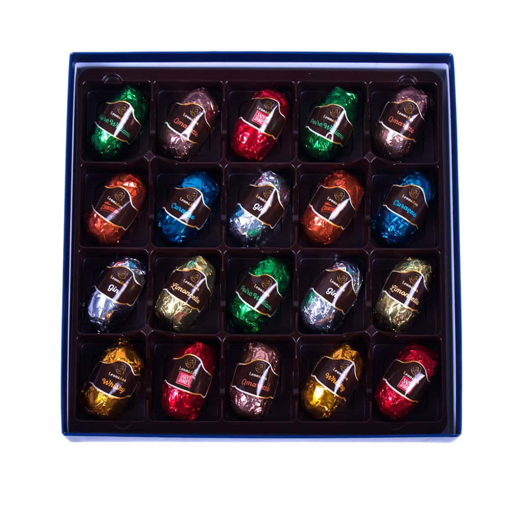 Σοκολάτα υγείας που στο εσωτερικό περιέχουν λικέρ σε 8 διαφορετικές γεύσεις: Amaretto, Cointreau, Limoncello, Gin, Saint James, Poire Williams, Whisky και Curacao!