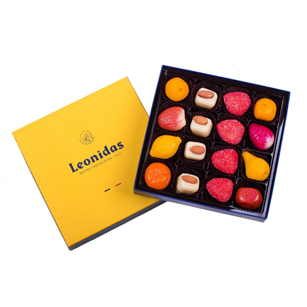 Χάρτινο κίτρινο τετράγωνο κουτί Heritage M με 390 γρ. αμυγδαλόπαστα (marzipan) Leonidas