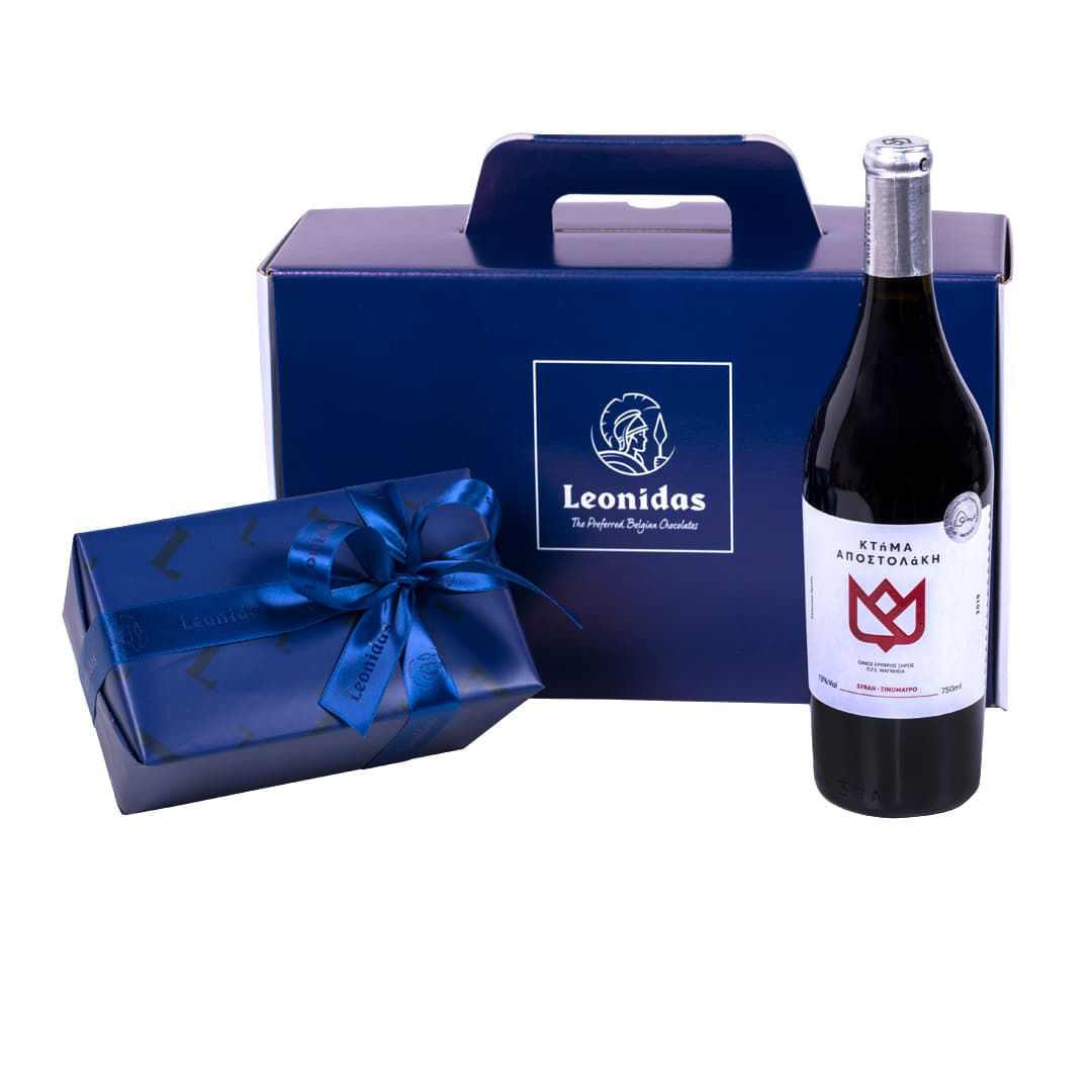 Χάρτινο κουτί Leonidas με σοκολατάκια και κόκκινο βιολογικό κρασί Οικογενείας Αποστολάκη