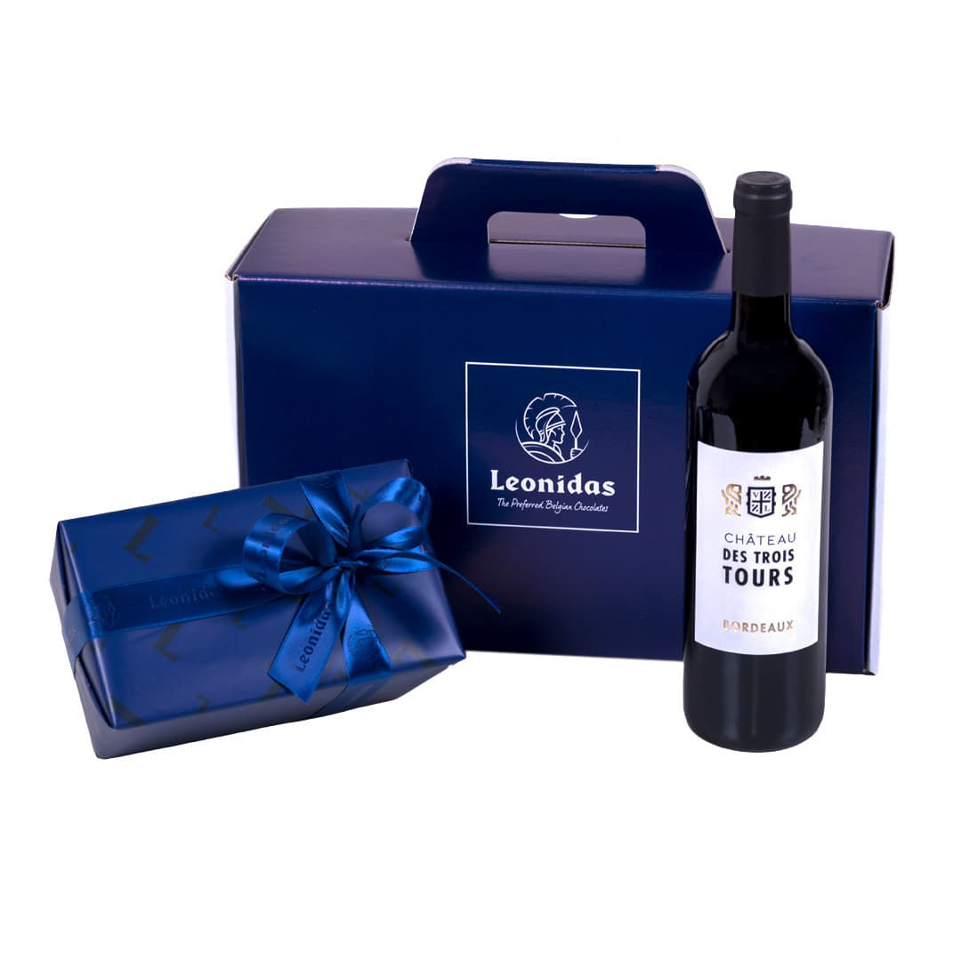 Χάρτινο κουτί Leonidas με σοκολατάκια και κρασί Chateau Des Trois Tours Bordeaux