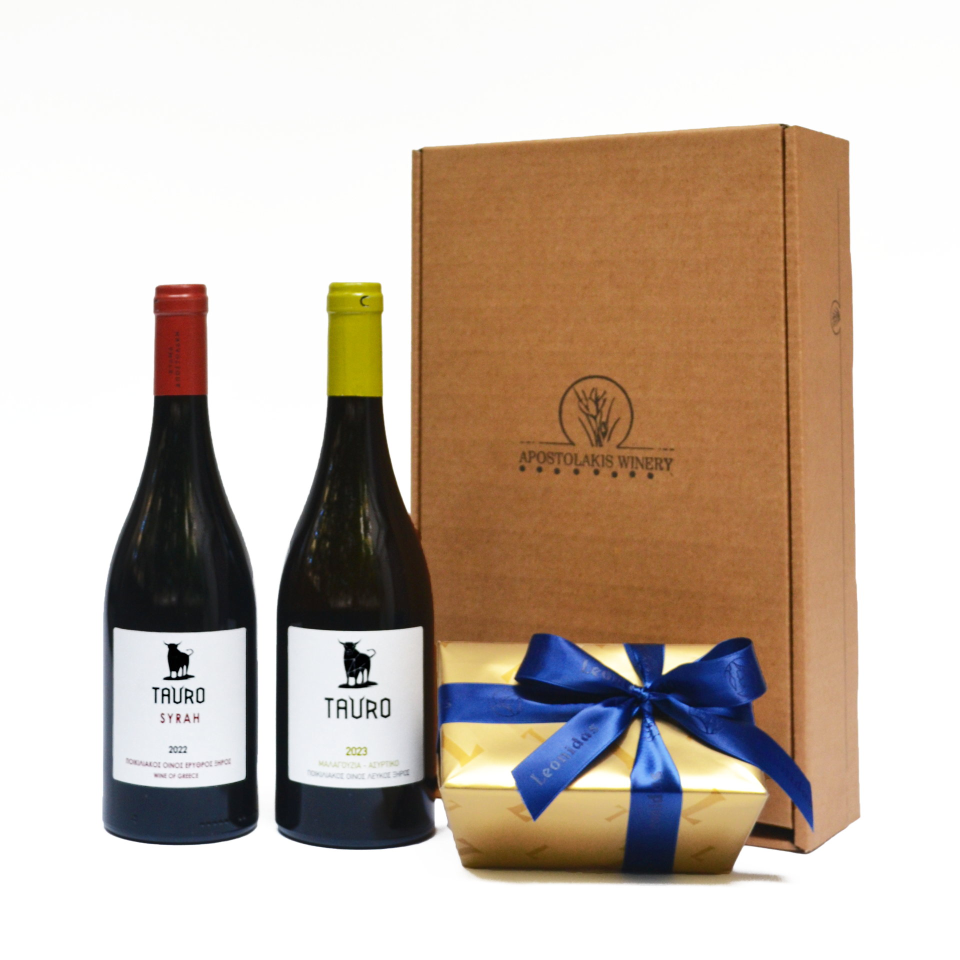 Χάρτινο κουτί με 500 γρ σοκολατάκια Leonidas και κρασια Tauro Αποστολάκη