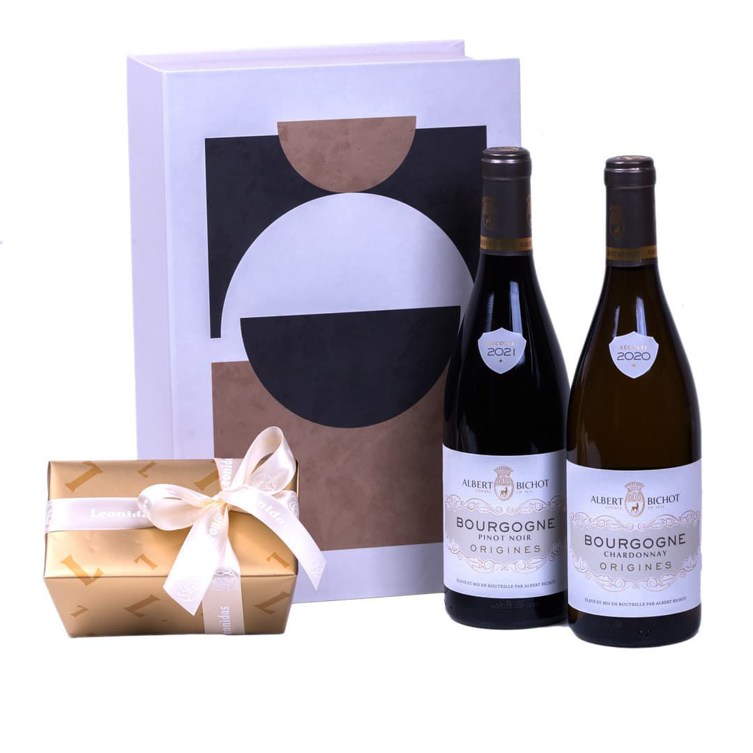 Χάρτινο κουτί με 500 γρ σοκολατάκια Leonidas και κρασια Βουργουνδίας Albert Bichot