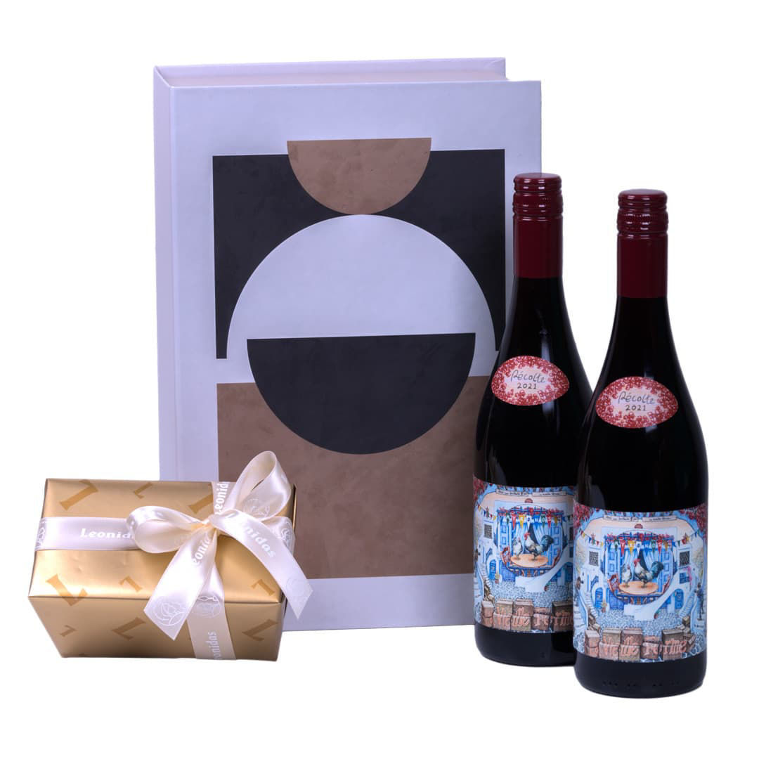 Χάρτινο κουτί με 500 γρ. σοκολατάκια Leonidas και κρασιά Ροδανού La Vieille Ferme