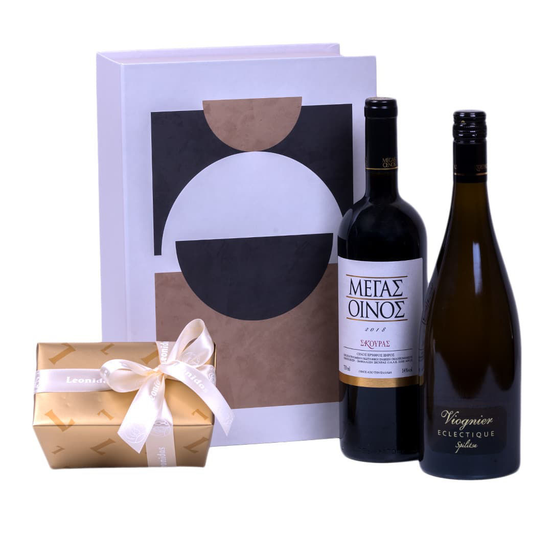 Χάρτινο κουτί με 500 γρ σοκολατάκια Leonidas και κρασιά Σκούρα Μεγας Οινος & Viognier Eclectique