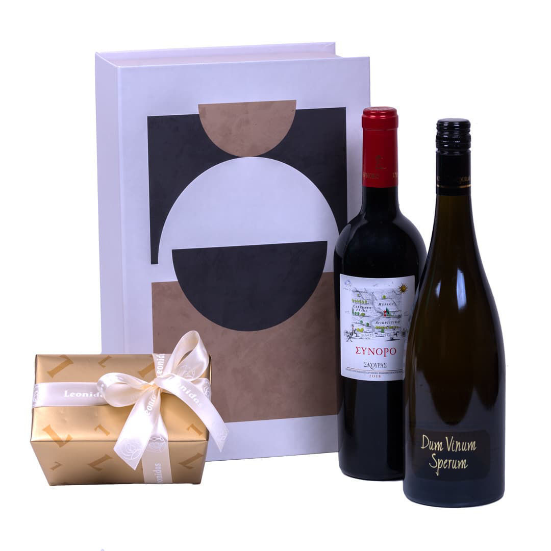 Χάρτινο κουτί με 500 γρ σοκολατάκια Leonidas και κρασιά Σκούρα Συνορο & Dum Vinum Sperum