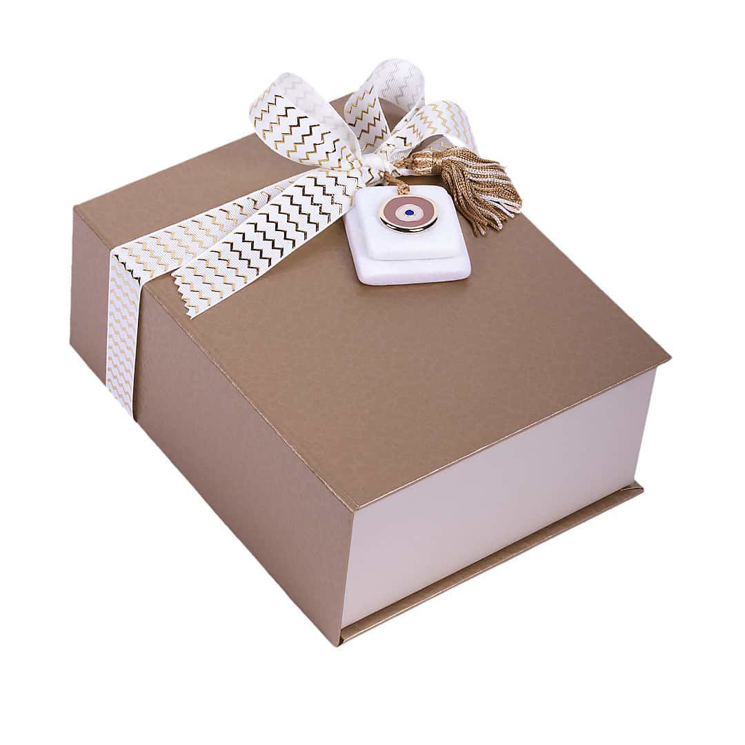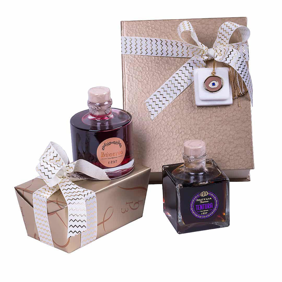 Χάρτινο κουτί με λικέρ Πολυκαλά βυσσινο, tentura και σοκολατάκια Leonidas