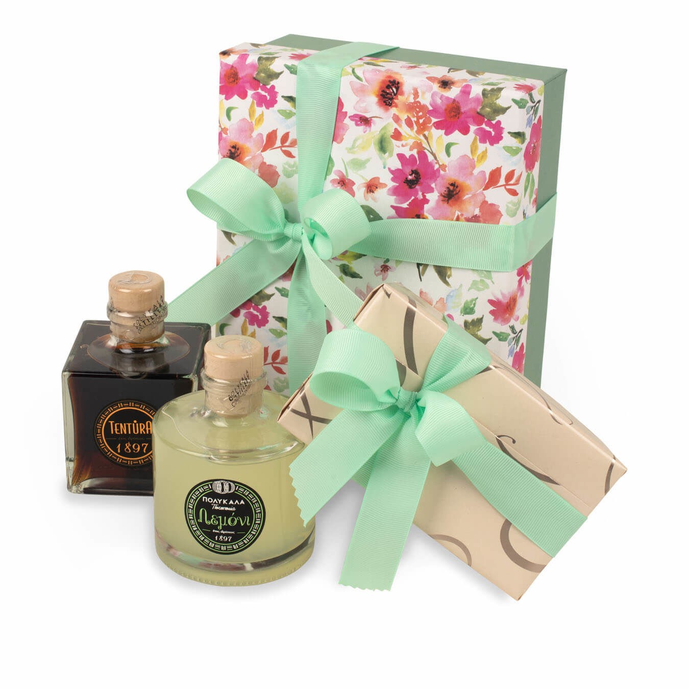 Χάρτινο κουτί με λικεράκια Πολυκαλά και σοκολατάκια Leonidas