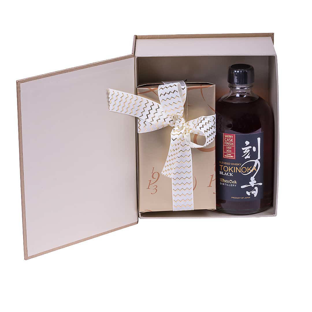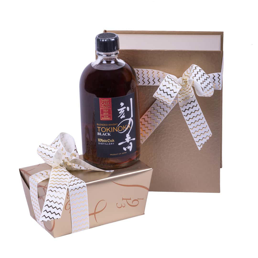 Χάρτινο κουτί με ουίσκι Ιαπωνιας Tokinoka και σοκολατάκια Leonidas