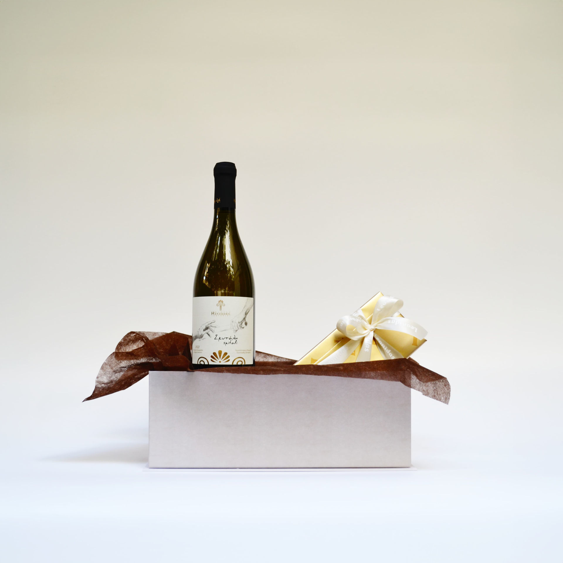 Χάρτινο κουτί με σοκολατάκια Leonidas και κρασί Χατζηδακη Σκυταλη