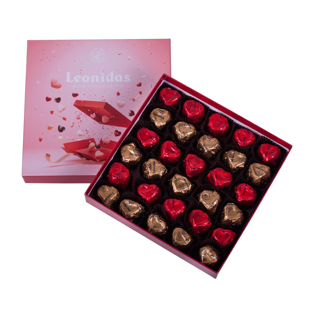 Χάρτινο τετράγωνο κουτί Αγίου Βαλεντίνου με 420 γρ - 30 σοκολατένιες τυλιγμένες καρδιές Leonidas
