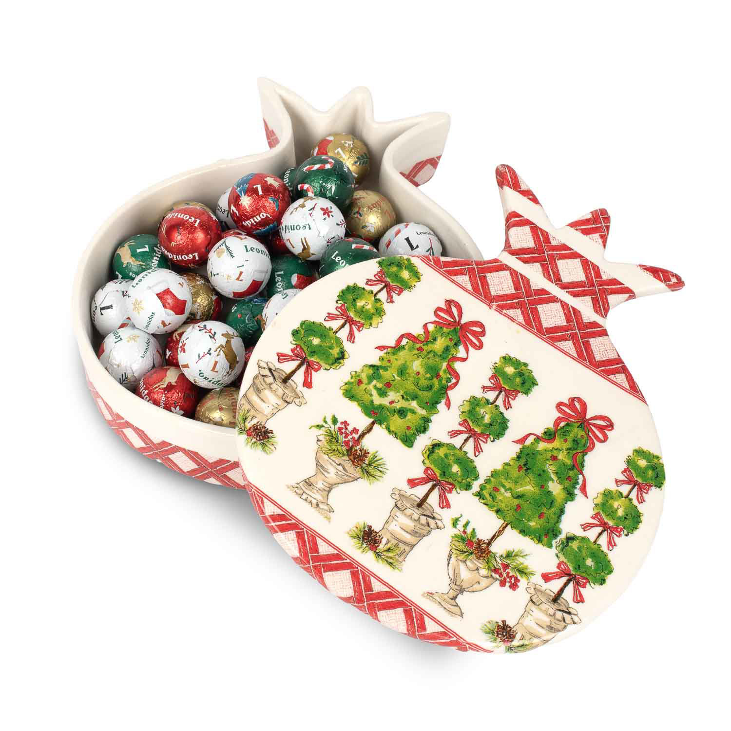 Χριστουγεννιάτικο διακοσμητικό κεραμικό κουτί σε σχήμα ροδιού με καπάκι με 300 γρ. ποικιλία σοκολατένιες χριστουγεννιάτικες μπαλίτσες Leonidas