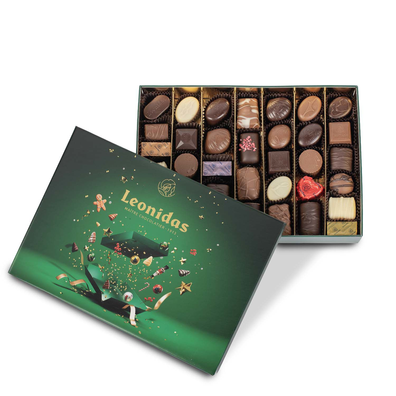 Πολυτελές, πράσινο κουτί με εορταστική θεματολογία, γεμάτο με βελγικές πραλίνες, λαχταριστές γεύσεις γκανάς, καραμέλα, φουντούκι, μπισκότο και πολλά ακόμη, παρασκευασμένες με αγνά υλικά και την παραδοσιακή τεχνογνωσία του διάσημου οίκου Leonidas.