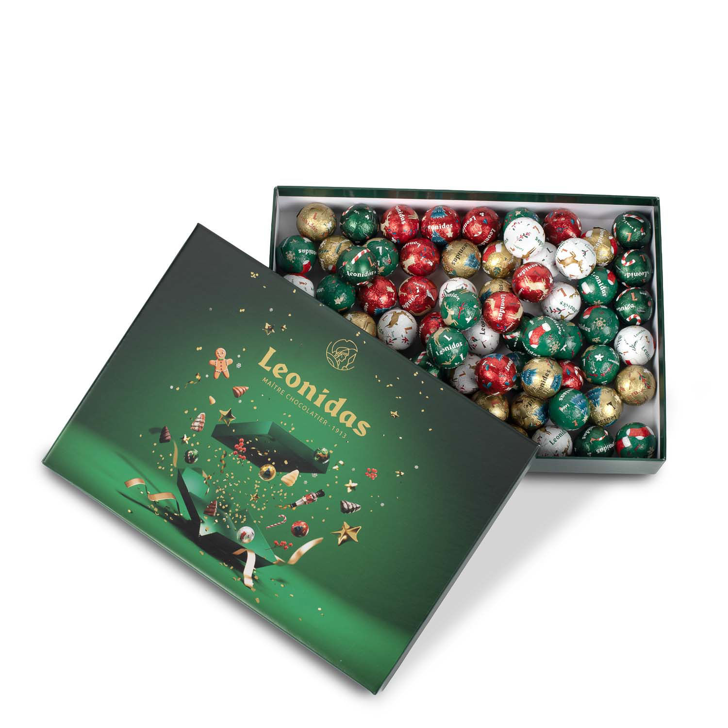 Χριστουγεννιάτικο πράσινο παραλληλόγραμμο χάρτινο κουτί με 750 γρ. ποικιλία σοκολατένιες χριστουγεννιάτικες μπαλίτσες Leonidas