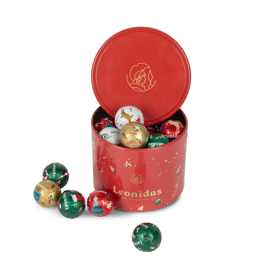 Χριστουγεννιάτικος μεταλλικός κύλινδρος με 20 χριστουγεννιάτικες σοκολατένιες μπαλίτσες Leonidas.
