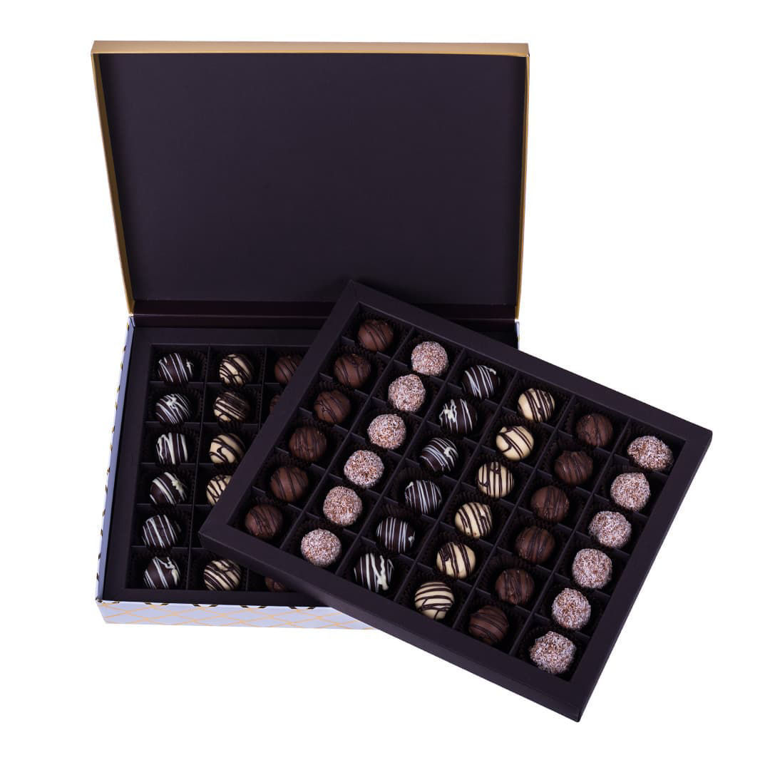 Χρυσό χάρτινο κουτί πολυτελείας με 1,088 κιλά σοκολατένια τρουφάκια Leonidas