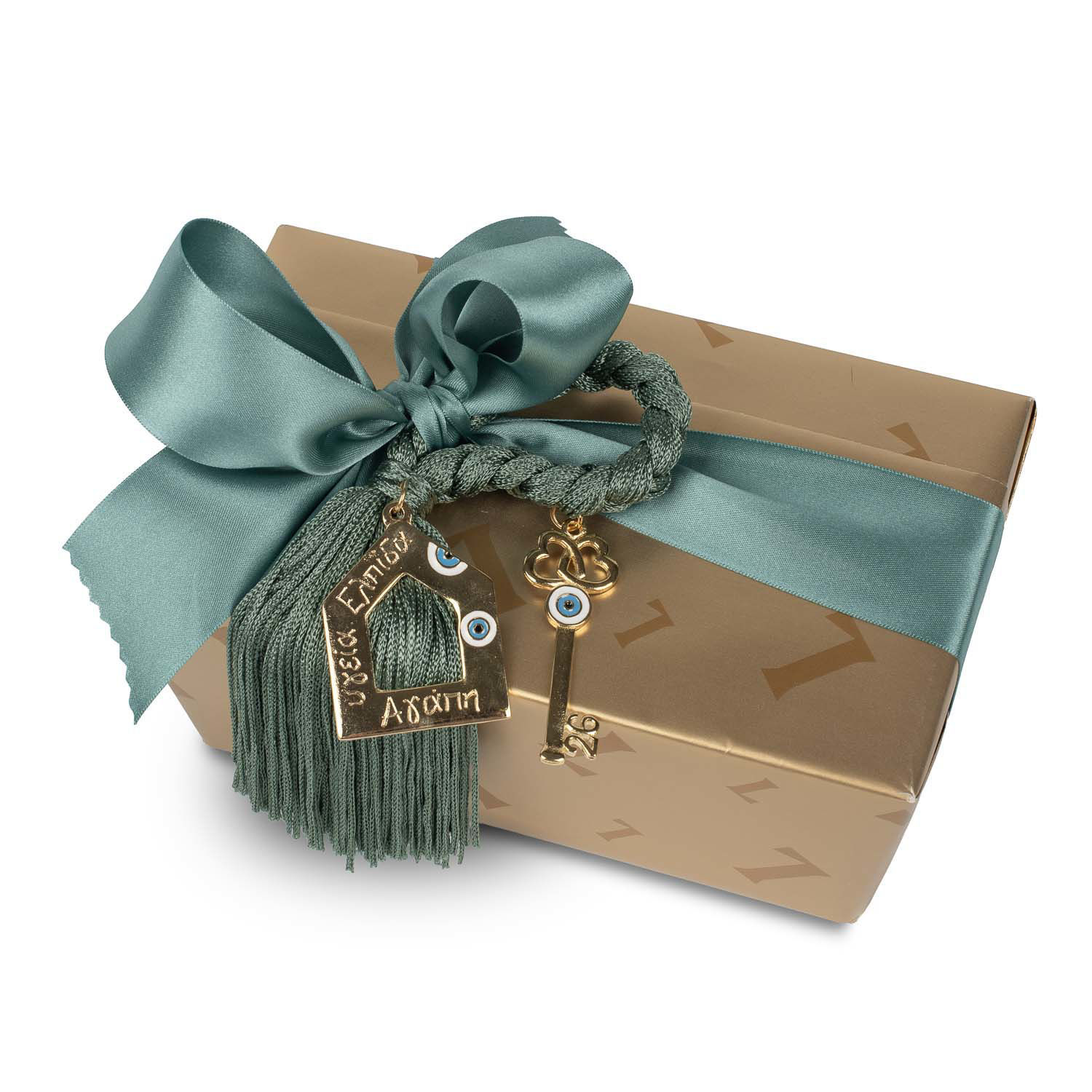 Ιδιαίτερο κουτί με χριστουγεννιάτικο αμπαλάζ και κορδέλα σε αποχρώσεις του χρυσού και του τιρκουάζ/βεραμάν, με διακοσμητικό γούρι!