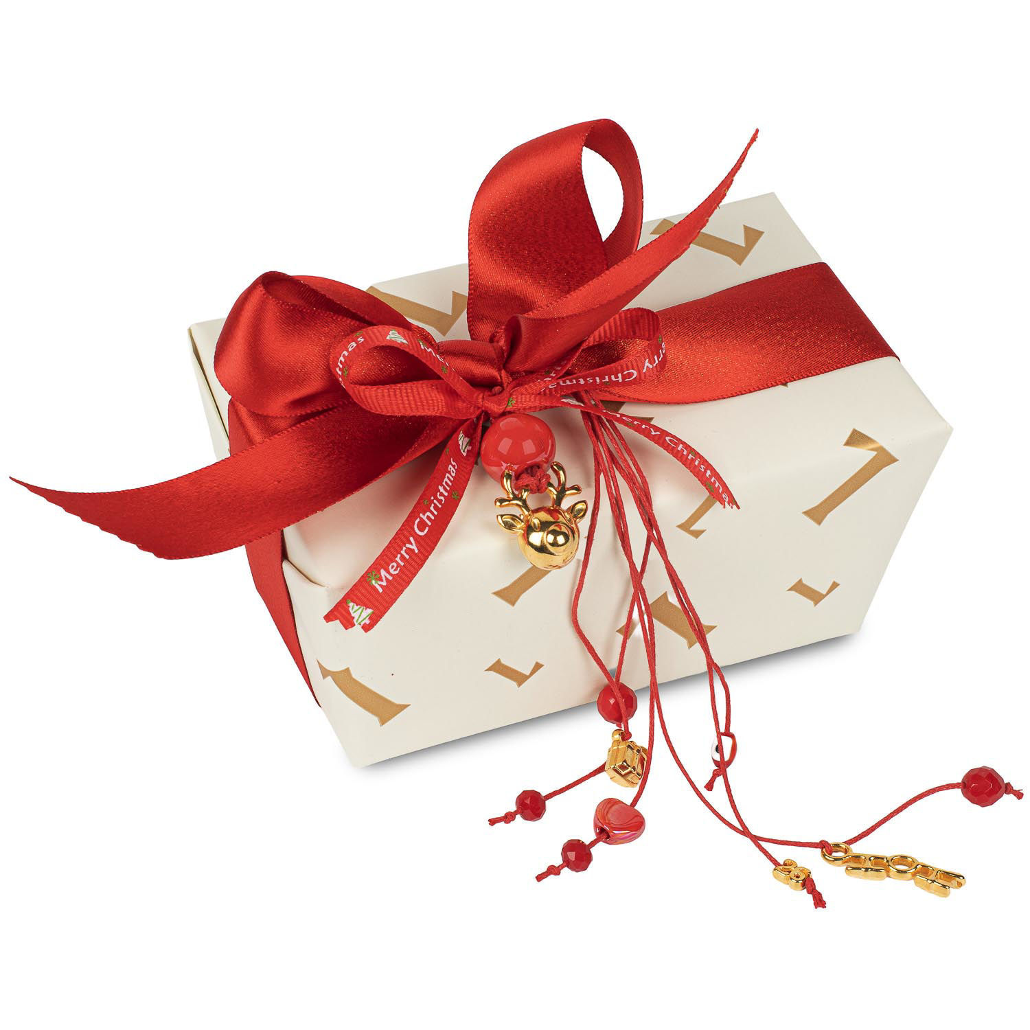 Κουτί με περιτύλιγμα σε κρεμ και χρυσούς τόνους Leonidas, διακοσμημένο με εορταστική κόκκινη κορδέλα και κομψό γούρι, κρύβει στο εσωτερικό του μια εκλεκτή ποικιλία από αυθεντικές βελγικές πραλίνες Leonidas.