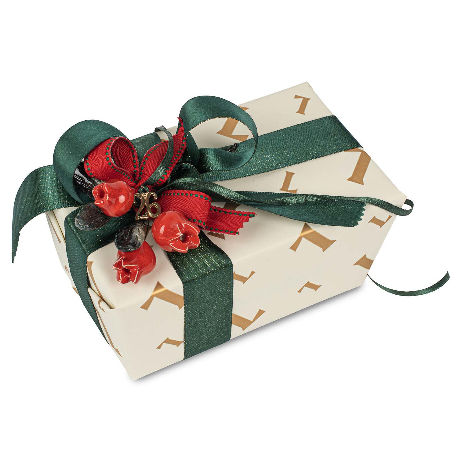 Ιδιαίτερο κουτί με χριστουγεννιάτικο αμπαλάζ και κορδέλα σε εορταστικές αποχρώσεις, με διακοσμητικά μικρά, κεραμικά ρόδια!