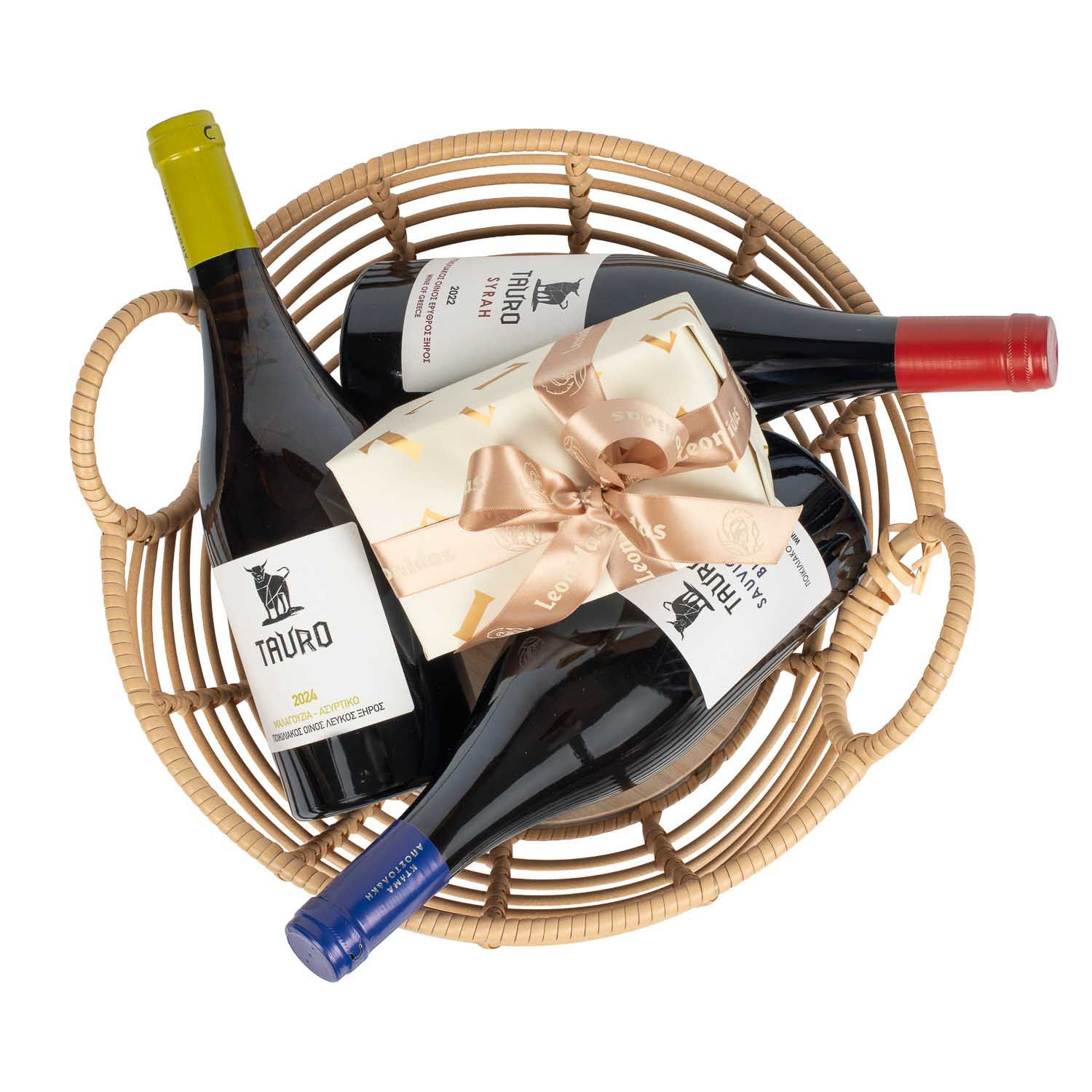 Καλάθι με κρασιά Αποστολάκη Tauro και σοκολατάκια Leonidas