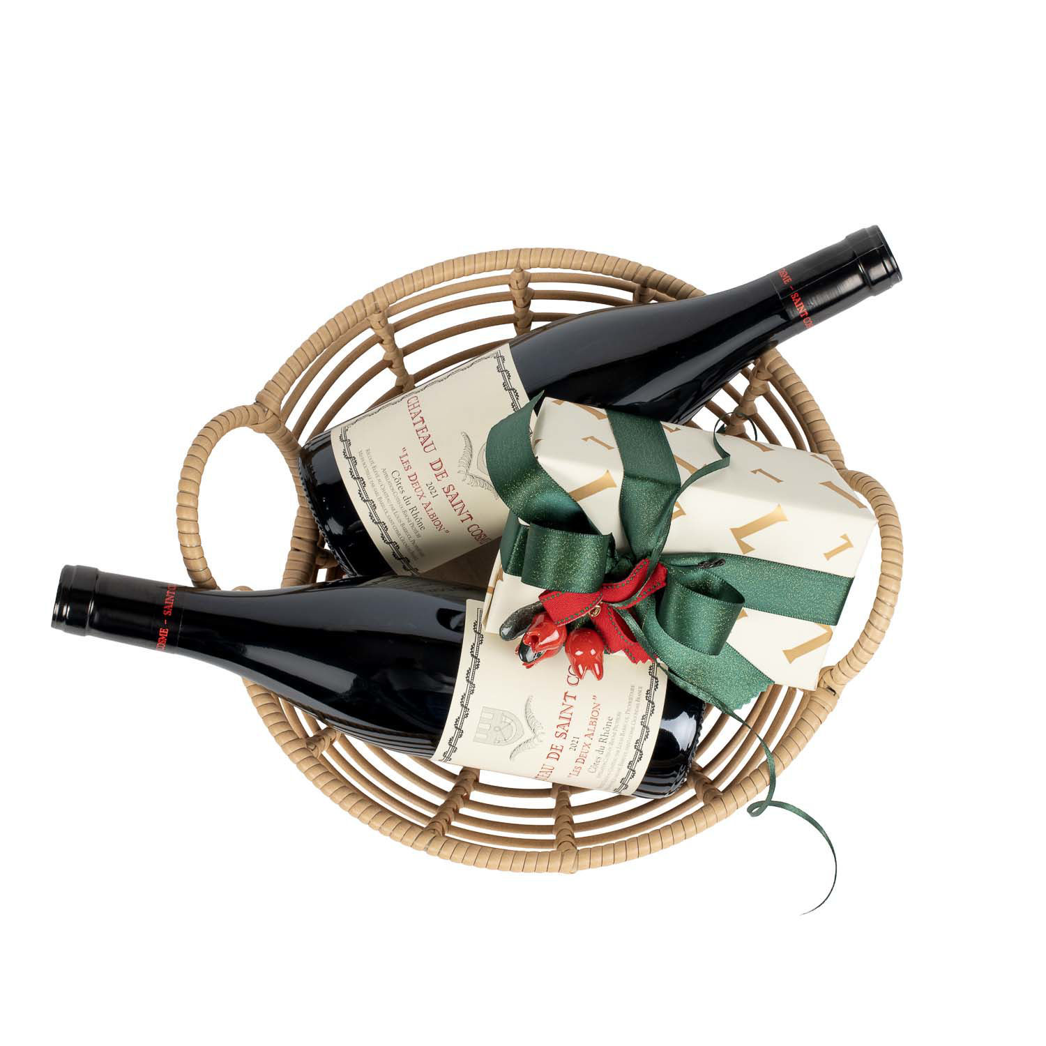 Καλάθι με κρασιά Ροδανού Γαλλίας Cotes du Rhone και σοκολατάκια Leonidas