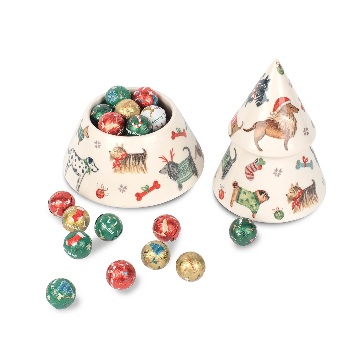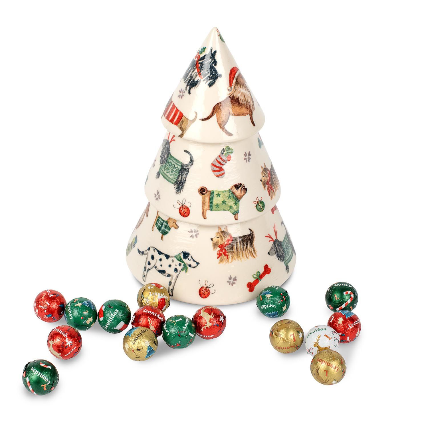 Κεραμικό διακοσμητικό σε σχήμα χριστουγεννιάτικου δέντρου με 350 γρ. ποικιλία σοκολατένιες χριστουγεννιάτικες μπαλίτσες Leonidas