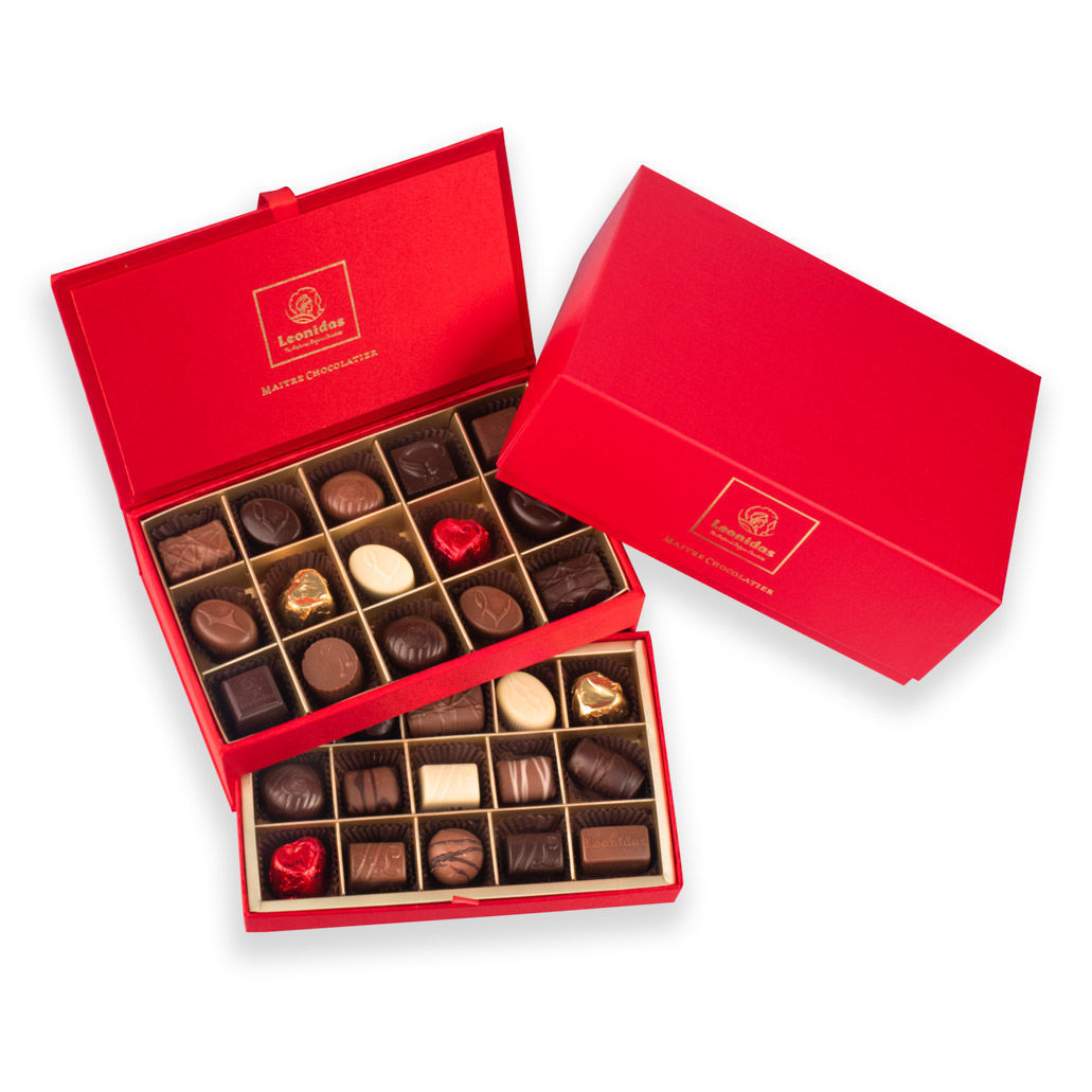Υφασμάτινη, κομψή, κόκκινη μπιζουτιέρα δύο επιπέδων με ποικιλία από 550 γρ σοκολατάκια Leonidas γάλακτος, υγείας και λευκά και γέμιση από πραλίνα, κρέμα βουτύρου, ganache, καραμέλας, λικέρ, σε ένα ιδιαίτερο κουτί δώρου!