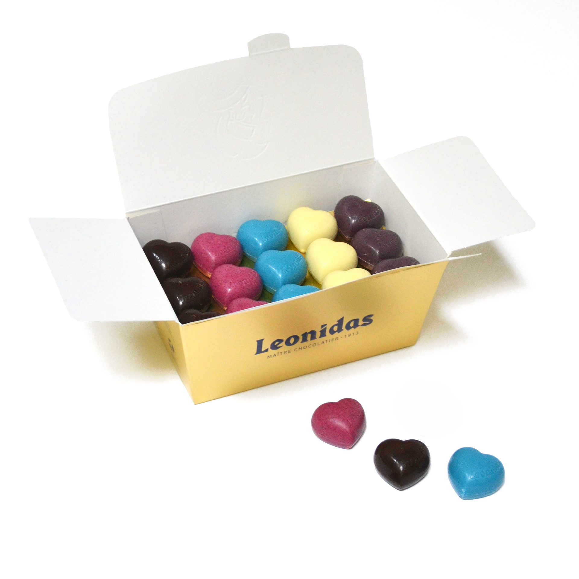 Ποικιλία από 500 γρ. σοκολατάκια Leonidas γάλακτος, υγείας και λευκά με γέμιση από πραλίνα, κρέμα βουτύρου, ganache, καραμέλας, λικέρ, συσκευασμένα στο κλασικό κουτί μπαλοτέν Leonidas!