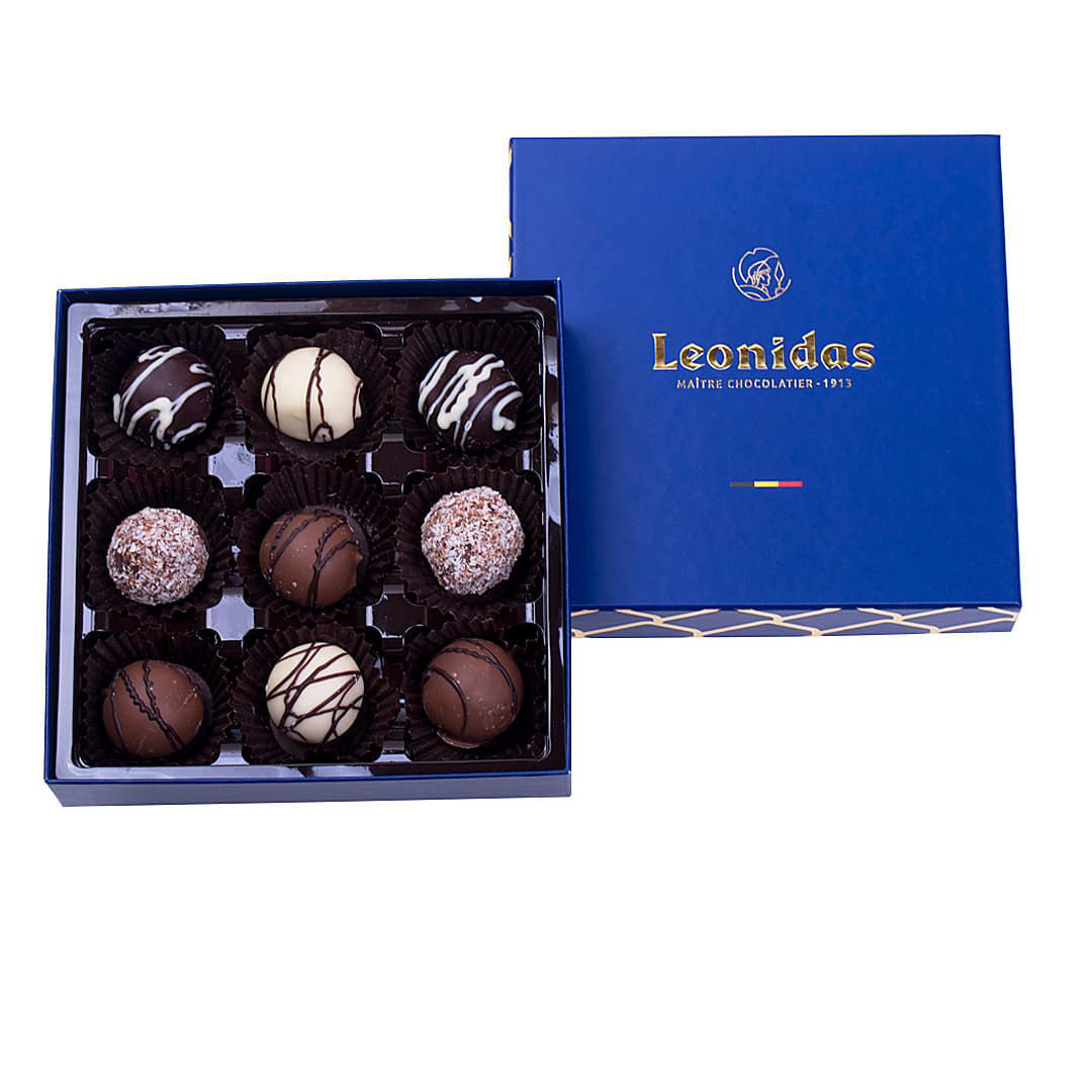 Χάρτινο μπλέ τετράγωνο κουτί Heritage S με 150 γρ. σοκολατάκια τρουφάκια (perles) Leonidas σε 4 γεύσεις:
