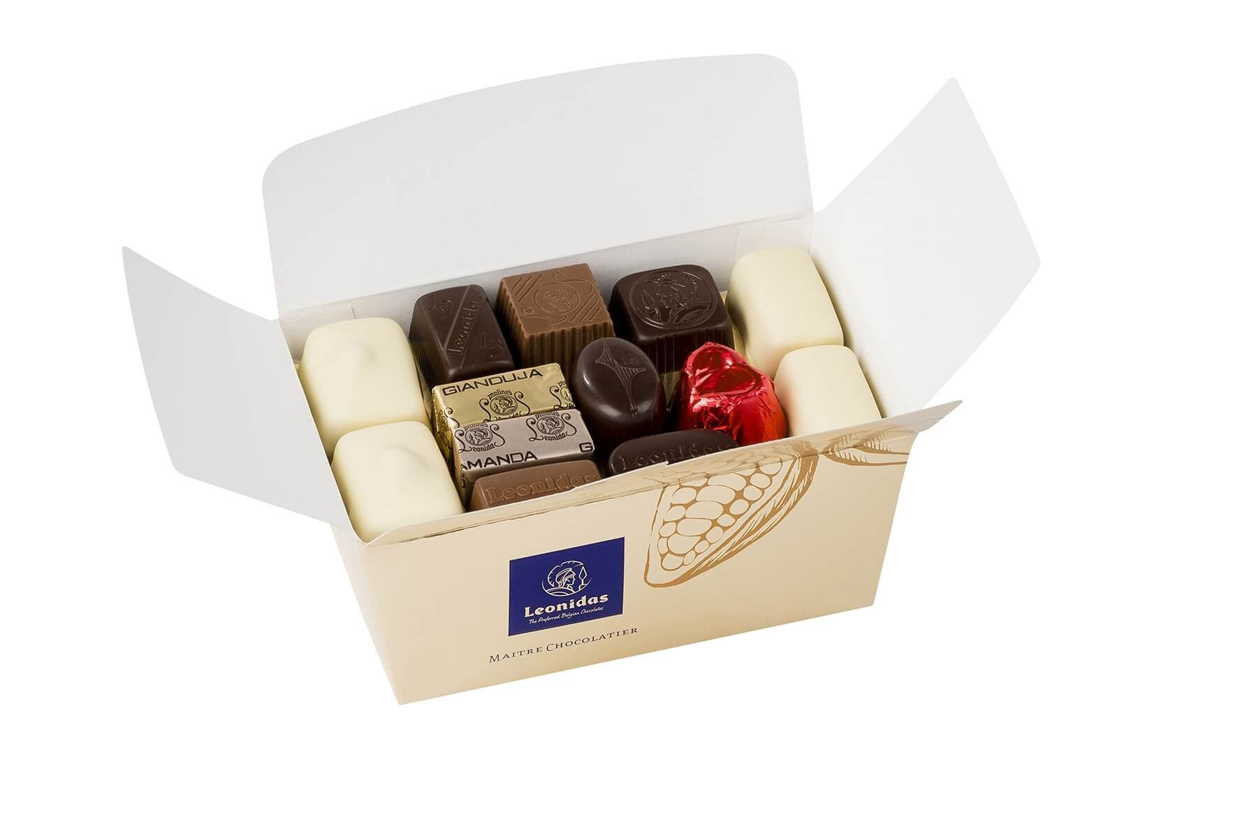 Κουτί με ποικιλία από 500 γρ. σοκολατάκια Leonidas γάλακτος, υγείας και λευκά με γέμιση από πραλίνα, κρέμα βουτύρου, ganache, καραμέλας, λικέρ, συσκευασμένα στο κλασικό κουτί μπαλοτέν Leonidas!