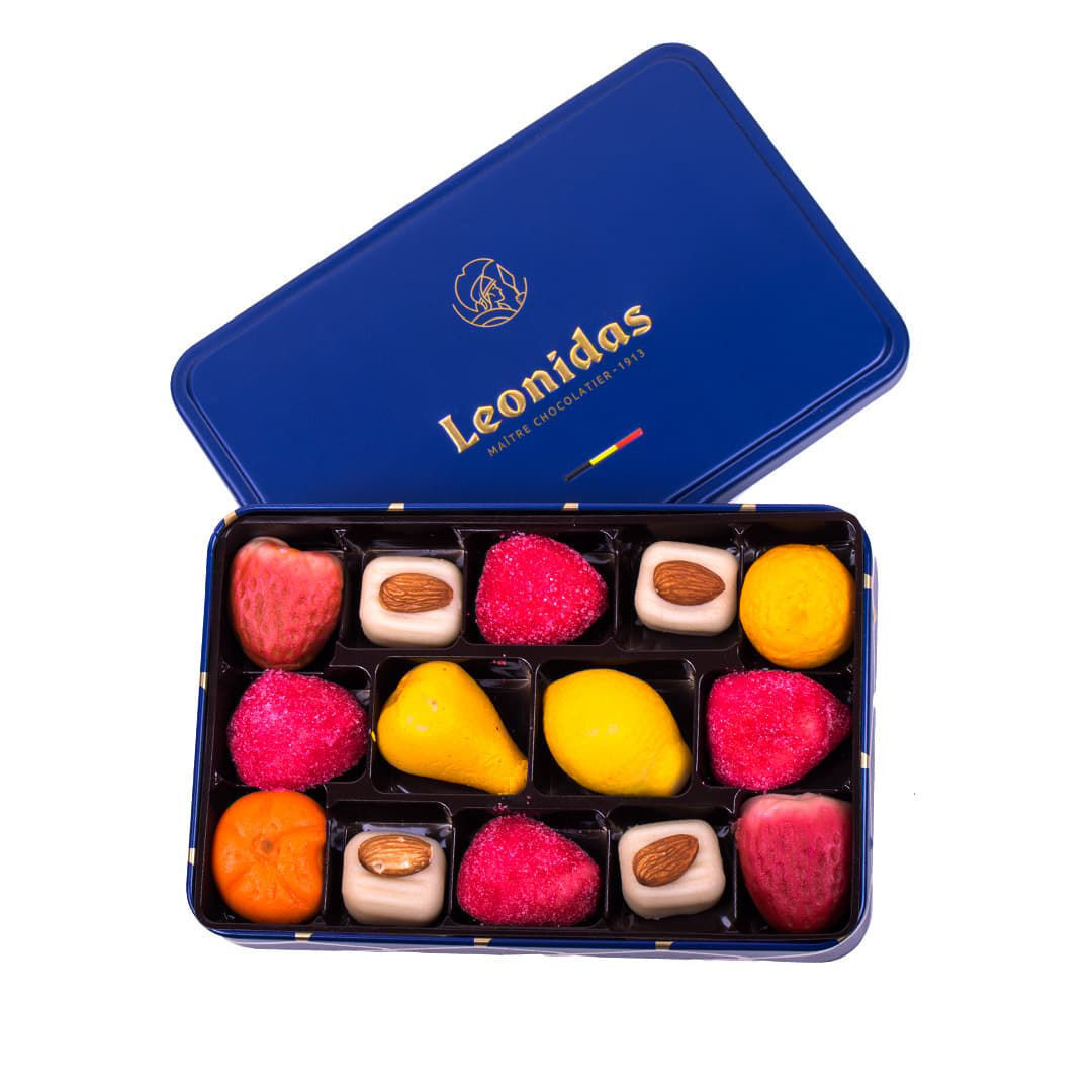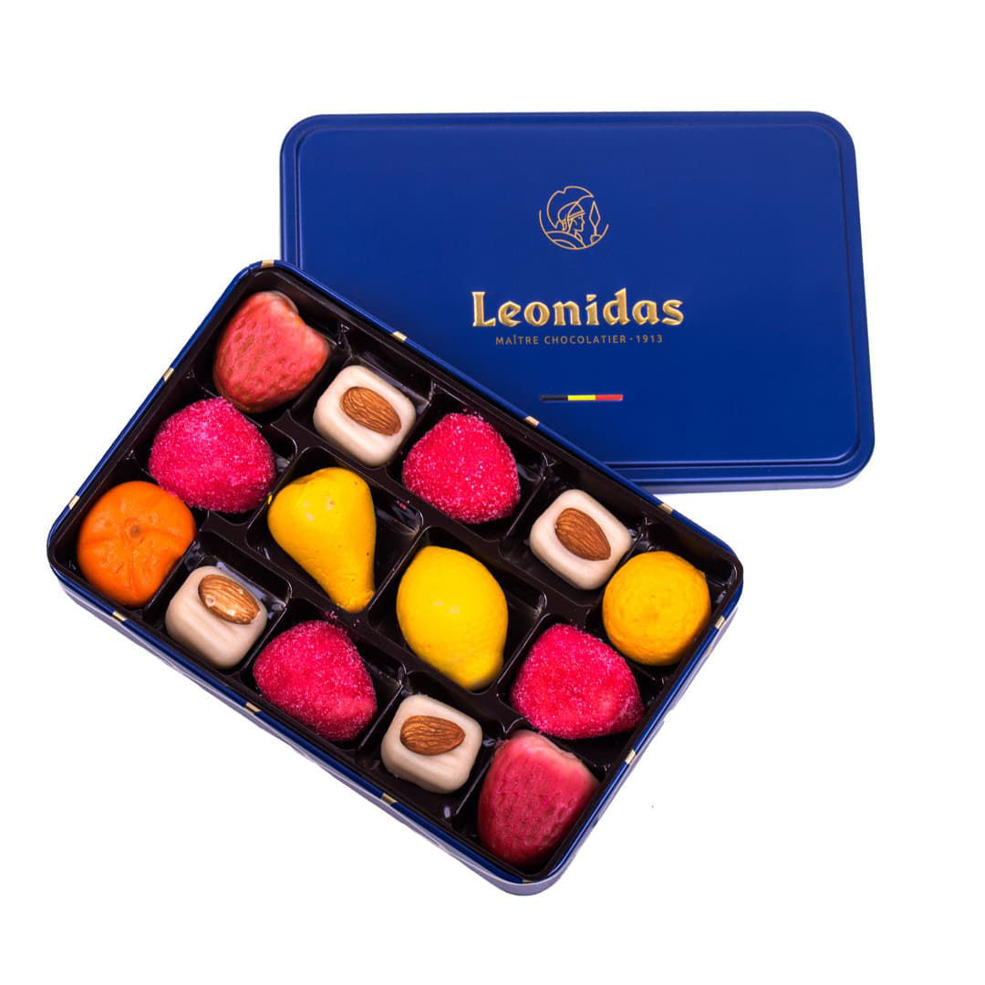 Ποικιλία από 500 γρ. σοκολατάκια Leonidas γάλακτος, υγείας και λευκά με γέμιση από πραλίνα, κρέμα βουτύρου, ganache, καραμέλας, λικέρ, συσκευασμένα στο κλασικό κουτί μπαλοτέν Leonidas!