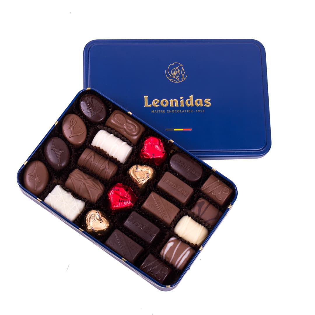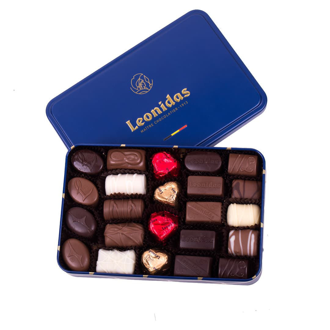 Μεταλλικό παραλληλόγραμμο μπλέ κουτί με 350 γρ ποικιλία σοκολατάκια Leonidas
