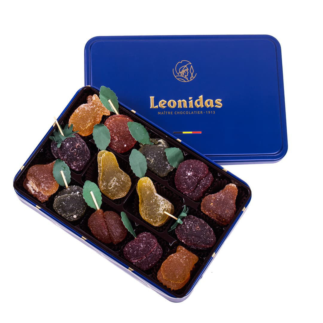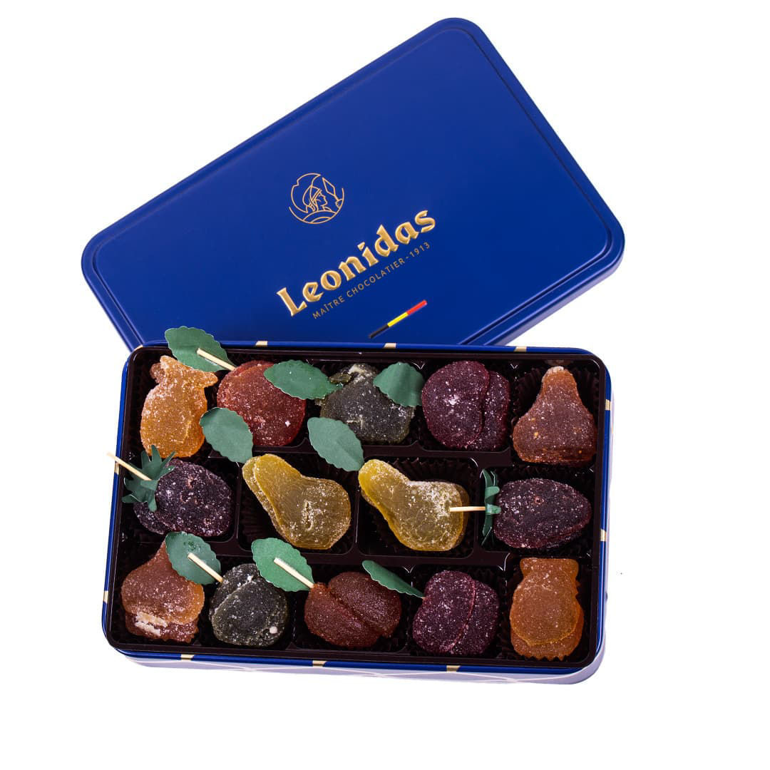 Μεταλλικό παραλληλόγραμμο μπλέ κουτί με 390 γρ. pates de fruit (ζελεδάκια φρούτων) Leonidas