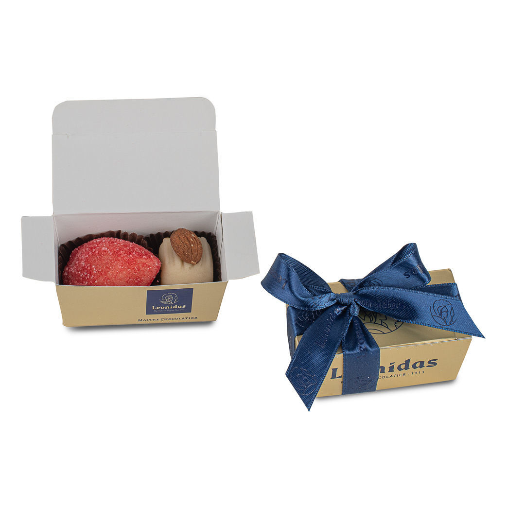 Μίνι χάρτινο κουτάκι σε χρυσό χρώμα με 2 αμυγδαλόπαστες (marzipan) Leonidas & κορδέλα.