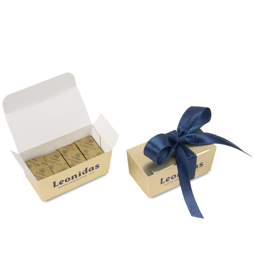 Μίνι χάρτινο κουτάκι σε χρύσο χρώμα με 4 σοκολατάκια gianduja Leonidas & κορδέλα