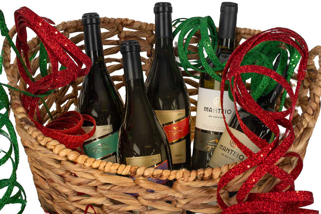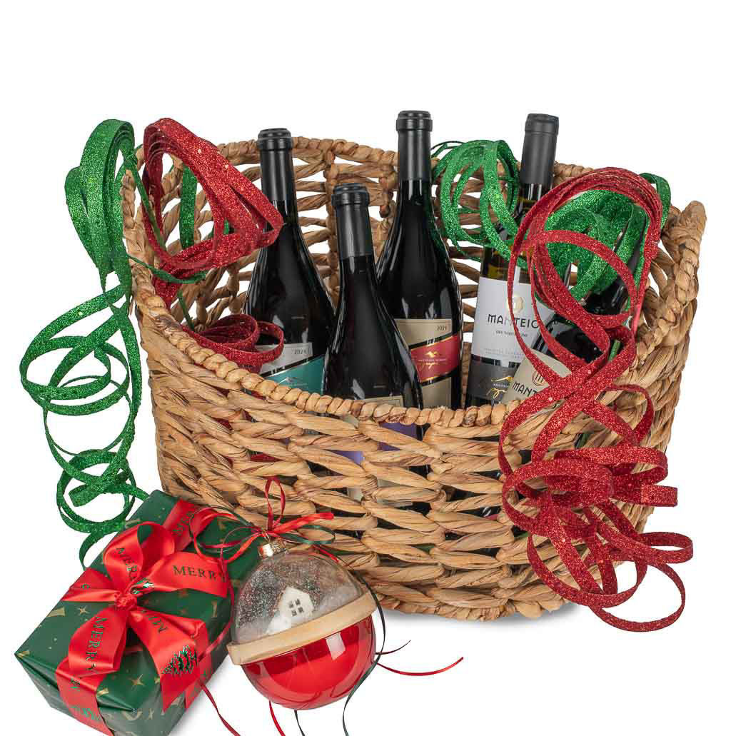 Ψάθινο καλάθι με χριστουγεννιάτικο αμπαλάζ, κρασιά Αργυρίου και 1 κιλό σοκολατάκια Leonidas